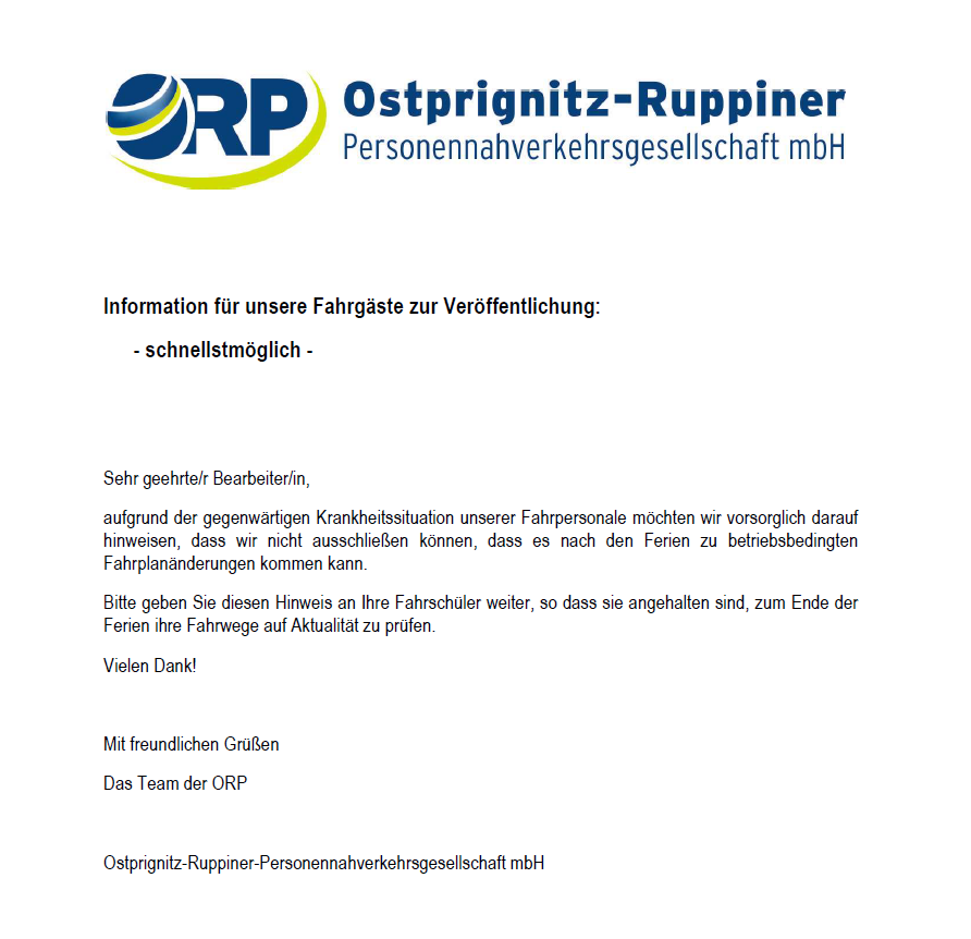 Seit dem 08.09.2025 greift ein neuer Fahrplan des ORP. Näheres darüber erfahren Sie auf